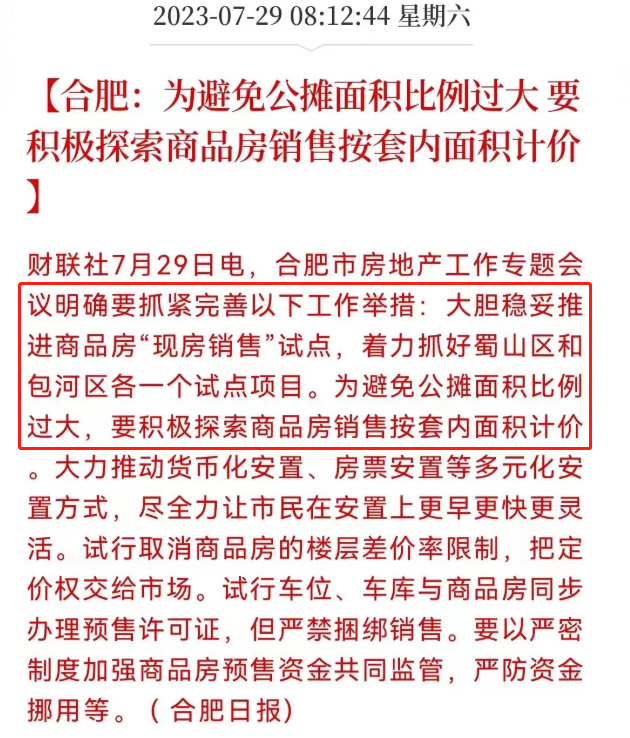 就在7月28日,合肥多部门召开专门会议,明确传达两大信息:一个是要积极探索“取消公摊”,商品房按套内面积计价。