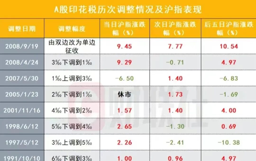 上一次印花税调整,还得追溯到15年前,一年两次调整,都引发大盘超9%的暴涨,所有个股几乎全部涨停,完全可以说是大盘涨停了。