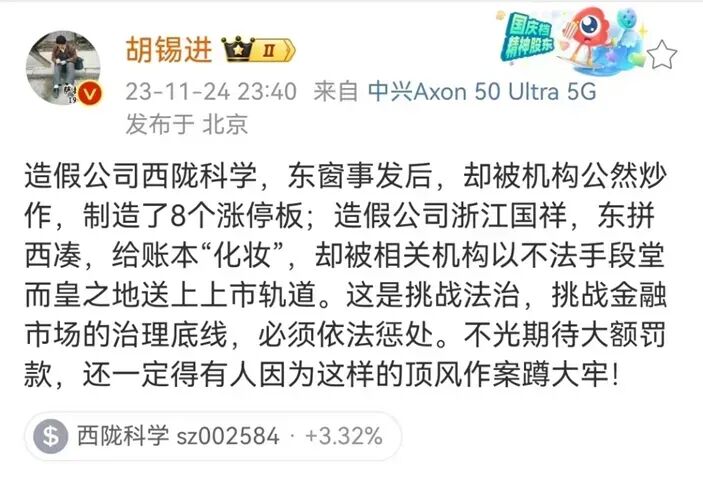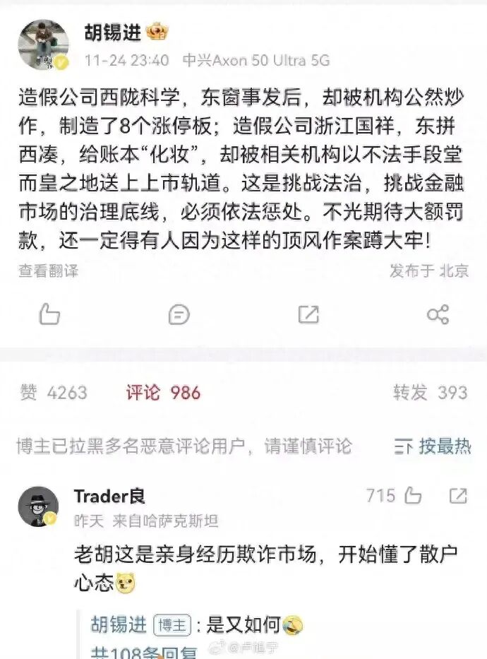 但这一次是真没忍住,胡锡进骂的是两家A股造假公司,西陇科学和浙江国祥,分明就是垃圾股票,却遭到各路资本疯狂爆炒,短短几句话就将一堆人都给骂了。