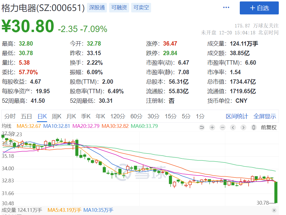 消息一出,格力股价当天崩了7%,股东们纷纷用脚投票,格力市值一天蒸发132亿。