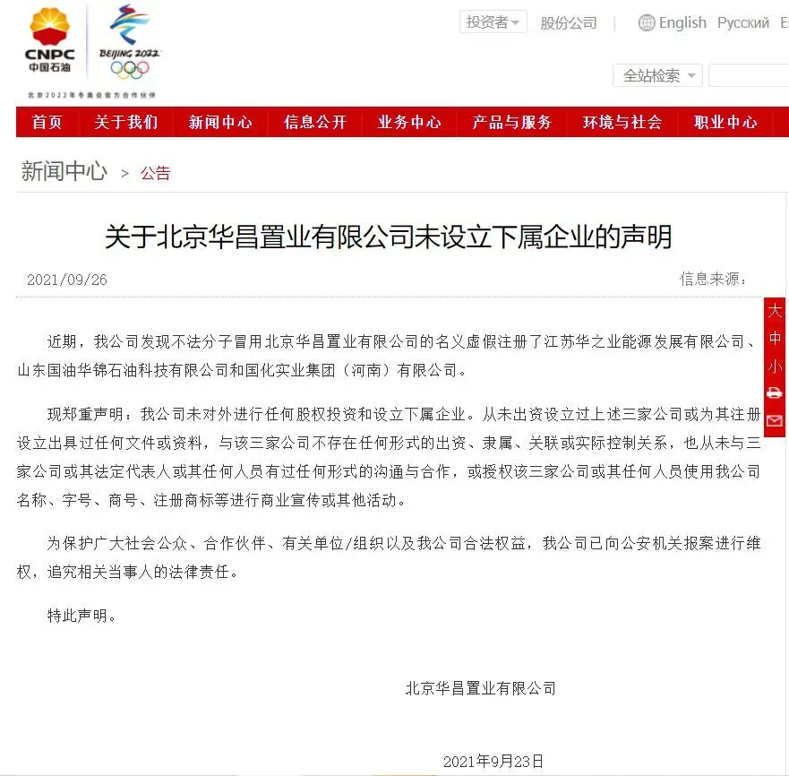 被强行拖下水的中石油,其实早在9月底就已经做出澄清,中石油子公司华昌置业发布明确通告表示:公司没有任何对外投资和设立下属企业,包括江苏苏华之业能源在内都是冒名注册的虚假公司!