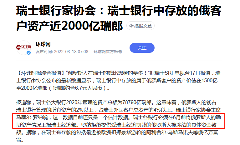瑞士政府突然出手,要求瑞士各银行必须在6月底前,将俄罗斯人的确切资产上报瑞士经济部,其中在瑞士有超过10万瑞郎(约68万人民币)资产的俄罗斯人,必须在6月3日前向政府申报。