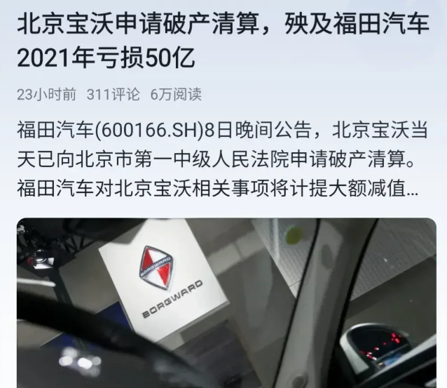 4月8日深夜,北汽集团旗下福田汽车发布公告称:北京宝沃因财务枯竭,无力清偿到期债务,决定申请破产清算,已向法院提交申请,公司为此亏损53亿。