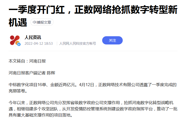 为河南健康码系统提供技术支持的是一家名为“正数网络科技有限公司”的企业,2020年8月由河南投资集团、河南移动、河南日报等合资成立,成色十足的国企,公司宗旨是“正数干正事,正数做实事,正数为人民”。