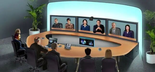 网真通过大尺寸电视、定制的会议室(颜色、灯光等)、定制的会议桌(半圆形)等,让在各地开会的人员“误以为”其他人员都坐在同一个会议室里,“身临其境”。