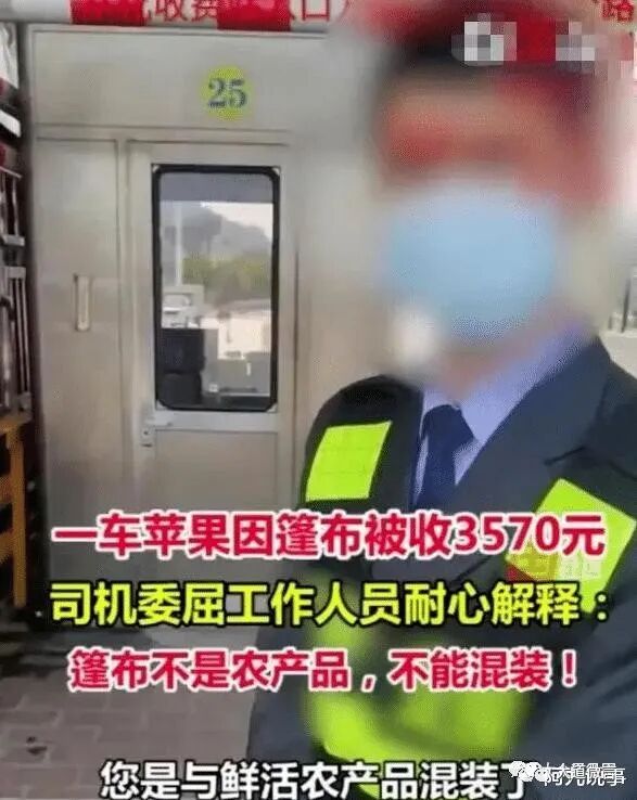 还有一名司机,拉着17吨的苹果可以享受绿色通道,但是因为车上一块篷布,却被罚款和收费了,因为收费站人员说了,苹果车上有篷布,这属于篷布与农产品混装,所以要支付高速费3570元。