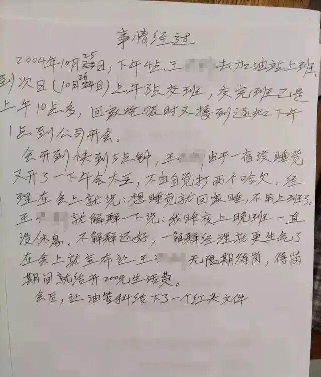 事情要从2004年说起,当时的王先生是吉林通化某加油站的员工。事发前一天他刚好是夜班,上班时间是下午4点到次日早日8点。等他早上下班交接好,已经是10点多。回到家刚吃2口饭,就接领导通知,说下午1点要开大会。