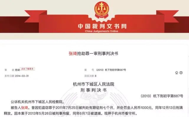 中国裁判文书网公布的一份由浙江省杭州市下城区作出的裁判文书显示,张琦曾因盗窃罪被判处有期徒刑,2014年再因抢劫罪被判处有期徒刑四年十个月。