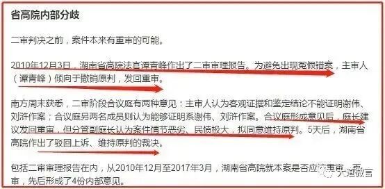 报道载明:2010年12月3日,湖南省高院法官谭青峰作出了二审审理报告。为避免出现冤假错案,主审人(谭青峰)倾向于撤销原判,发回重审。