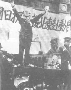 上海青年300多人组成的“赴东北援马抗日团”。张少杰团长在火车站向欢送人群致诀别词:“除非我们死,我们决不回来!(注意旁边的棺材)