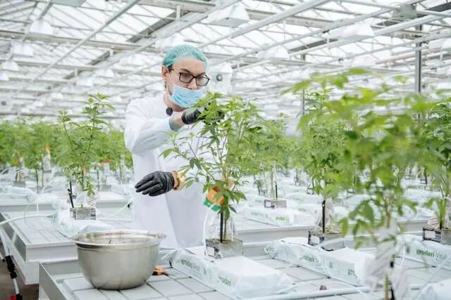 加拿大安大略省芬威克市,一个种植技术人员在大麻生产工厂的种植园内修建枝叶