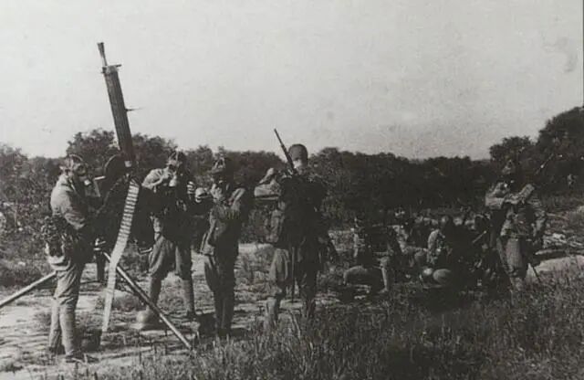 日军在保定上空投掷毒气弹,中国士兵头戴防毒面具对空警戒