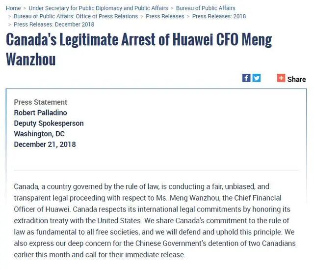 美国认为加拿大拘留中国华为公司首席财务官孟晚舟是合法的,同时美国对中国拘留两名加拿大公民一事表示关切。