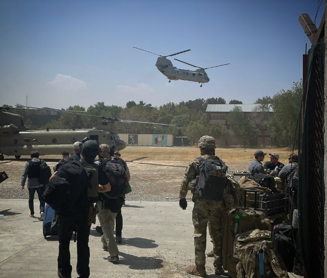 美国驻喀布尔大使馆的第一张内部照片,两架支奴干直升机分批次降落在使馆内部的草坪上,可见事态已经非常紧急,美军临时增援的5000兵力大部分都在使馆周围警戒,还有一些则充当免费劳动力为这些领导们搬运行李,美国大兵打仗不行,逃跑还是专业的。