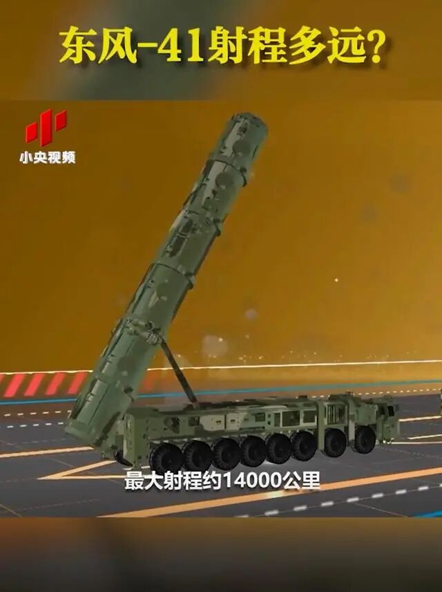 东风41采用三级固体火箭发动机,最大射程14000公里,可以携带分导式核弹头,打击精度为100米,这极大提高了中国核力量的威慑和生存能力。另外央视还强调,东风41的智能化程度非常高,仅需几个人就能完成全部发射程序!东风41还具备极佳的灵活机动性,在高速公路甚至普通篮球场上,就能进行无依托的发射。