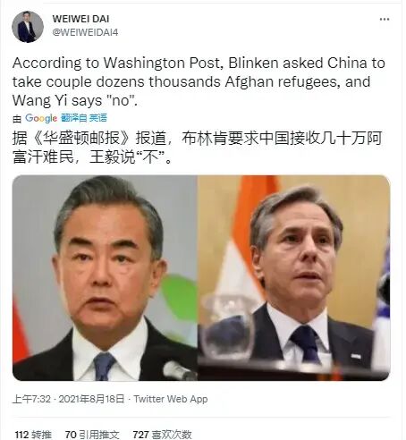 布林肯要求中国接收几十万阿富汗难民,王毅外长明确说“不”。
