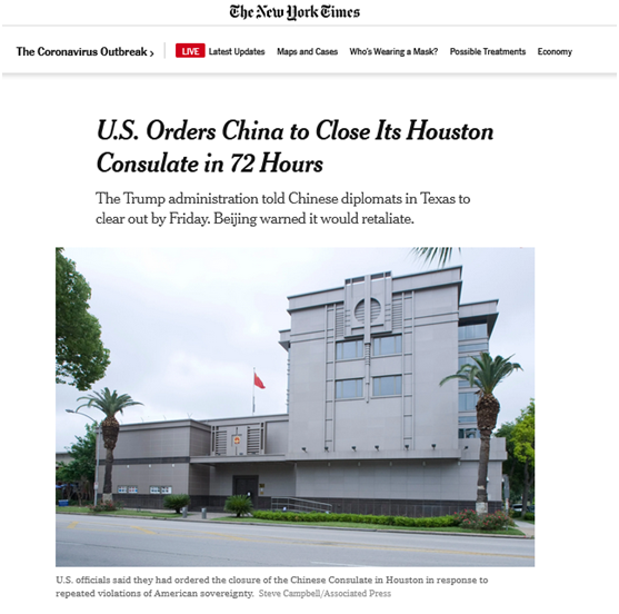 美方突然要求中方关闭驻休斯敦总领馆。对两国迅速恶化关系的又一次打击!这对迅速恶化的两国关系来说又是一次打击。中国立即誓言进行报复,称美国此举系非法。