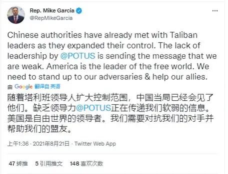 美国共和党籍众议员迈克·加西亚(8月21日)说道:“随着塔利班扩大其控制范围,中国已经会见了他们的领导人。拜登总统缺乏领导力在发出我们软弱的信息。美国是自由世界的领导者。我们需要站起来直面我们的对手并帮助我们的盟友们。”