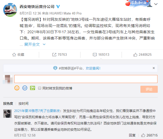 2021年8月30日下午17:38左右,一女性乘客在3号线列车上与其他乘客发生口角。期间,该乘客不断辱骂身边乘客,并与部分乘客产生肢体冲突,严重影响了车厢内乘车秩序。列车安全员发现后立即进行劝阻,在多次劝离未果后,为确保车厢内乘车秩序,17:45列车到达大雁塔站后,安保人员与其他热心乘客一起将该女乘客带离车厢。