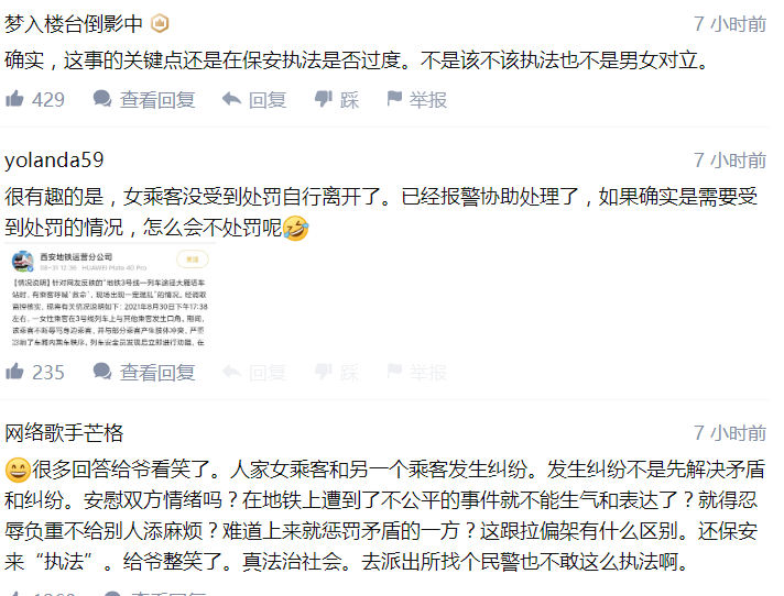 其次,地铁声明中完全忽略了女乘客被粗暴拖曳的事实,有文过饰非的嫌疑。安保人员有没有权力采取暴力?他拖拽到女乘客外衣撕破,露出内衣,暴露在大庭广众之下,这是处置手段失当,还是已经涉嫌侮辱女性?西安地铁声明中,不认为自身有任何问题,这是整件事中最让人不满的地方。