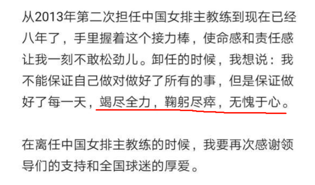 在1号,郎平正式官宣卸任中国女排的主帅,她也在文中回应了这次的失利,尤其是对于外界对自己的质疑,郎平也是非常有力地进行了回击,说自己“竭尽全力,鞠躬尽瘁,无愧于心”,12个字字字戳心窝,这个回应同样也是在回击排协的甩锅。