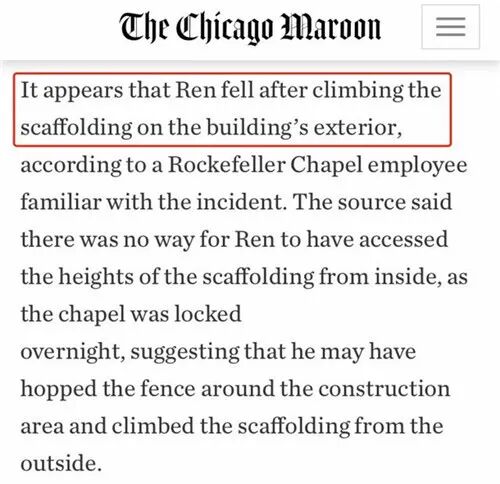 2008年11月2日,芝加哥大学博士生任伟,在洛克菲勒教堂后的仓库脚手架下面被发现。发现时他已经离世。从调查结果看,任伟看上去是自己结束了自己的生命。我们有充分的理由相信,任伟先是爬上了仓库后面的脚手架,随后在上面走路时摔倒,跌下了脚手架身亡的。他这样做的动机不得而知,但极有可能是因为抑郁或者重大创伤。调查还显示,任伟有可能是在教堂晚上关门之前,留在了教堂里。因为从教堂外面是无法进入仓库的,教堂会在夜间关门。(原文翻译自:The Chicago Maroon)。
