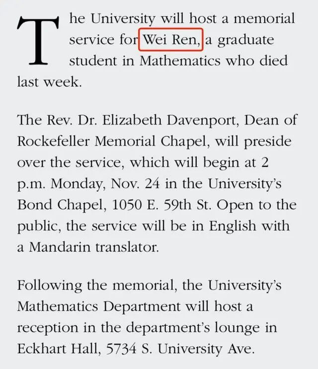 2008年11月2日早上,坐落在美国伊利诺伊州的芝加哥大学校园内,学生们正朝气蓬勃地前往各自的课堂。这一天上午,正在攻读博士四年级,但已经取得芝加哥大学讲师资格的中国天才数学家任伟,有一门本科生课程需要讲授。但是他的学生们这一天和以后的日子再也见不到这位中国数学老师了。这一天晚上9点,有人在芝加哥大学洛克菲勒教堂后面的仓库脚手架下面,发现了任伟。此时,任伟已经离开世界十几小时了。这件事传入芝加哥大学校长和董事会耳朵时,他们的第一反应是:封锁效益——嗯,这个世界上最发达的资本主义社会,在这种时候,总是什么都考虑到了,唯独不考虑人。