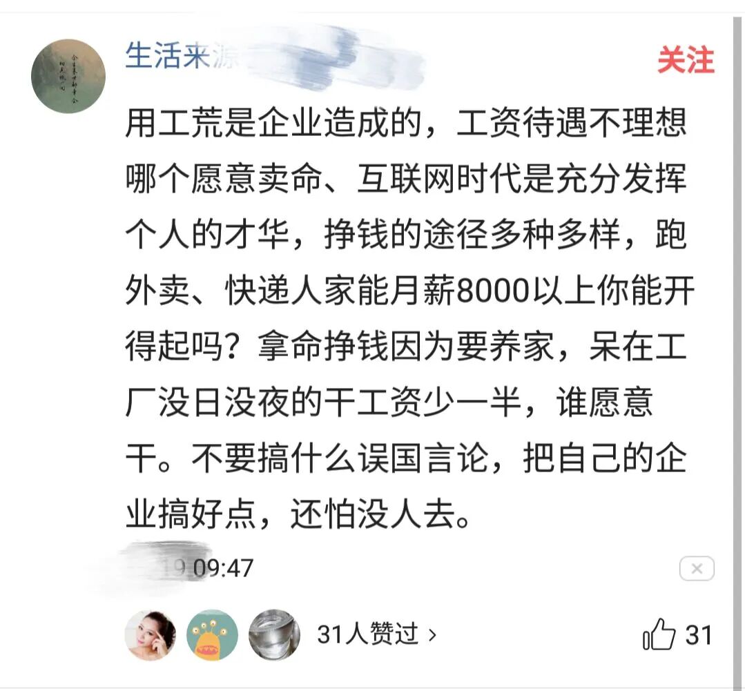 进工厂首先一点就是太辛苦,很多工厂都是12小时制的两班倒,并且工作枯燥乏味,日复一日的重复几个动作。其次,进厂虽然工资高,但那需要用加班来换,如果不加班,工资或许还没有送外卖高,也没有送外卖轻松自由。