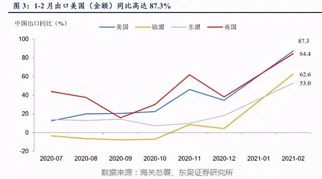 实际上总的数额三者差距不大,但如果单纯看出口数据的话,则美国一下子就可以排到我国出口的第一大市场了。而且对美出口的增长是吓死人的。因为今年1~2月,我国对美出口同比增长了87.3%,几乎翻了一番。