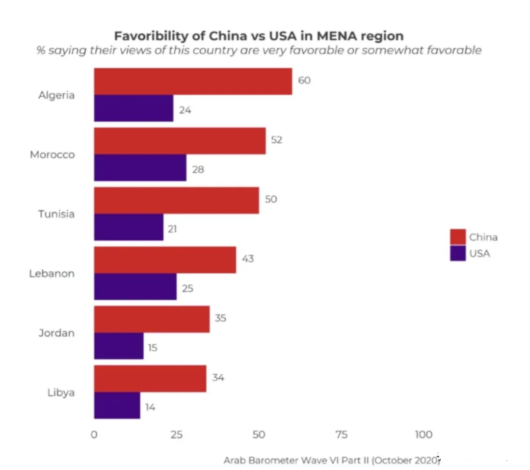 中美现在是全球两个超级大国,但是中美在中东国家的国家形象存在很大的差别,美国在该地区的形象很差,中国的形象相对更好。根据最近的一个调查,60%的阿尔及利亚人对中国持正面评价,而美国在阿尔及利亚的正面评价率只有24%;52%的摩洛哥人对中国持正面评价,而美国在摩洛哥的正面评价率只有28%;50%的突尼斯人对中国持正面评价,而美国在突尼斯的正面评价率仅为21%;43%的黎巴嫩人对中国持正面评价,但是美国在黎巴嫩的正面评价率只有25%。中美的形象差距,详见图片。美国给中东带来了战争和混乱,所以美国在中东国家的形象很差;中国不干涉中东地区事务,愿意帮助中东国家发展经济,所以中国在中东国家的形象很好。相信如果没有西方媒体的抹黑,中国在这些国家的正面评价率会更好。