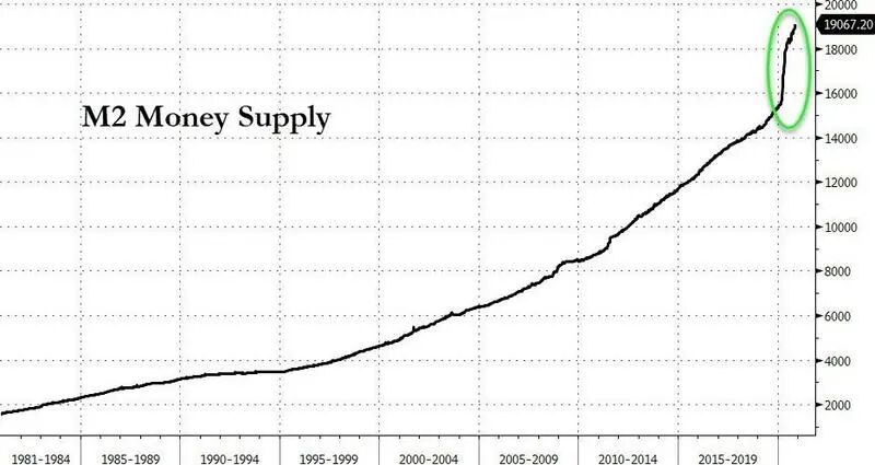 自病毒在美国蔓延以来,美国已经在短短的34周内总计放水了达18万亿美元的基础货币流动性和经济刺激方案,正如下图数据所示,美国货币M2曲线在2020年呈指数级增长,实际上自从新冠病毒在美国开始蔓延以来,该曲线几乎垂直了。