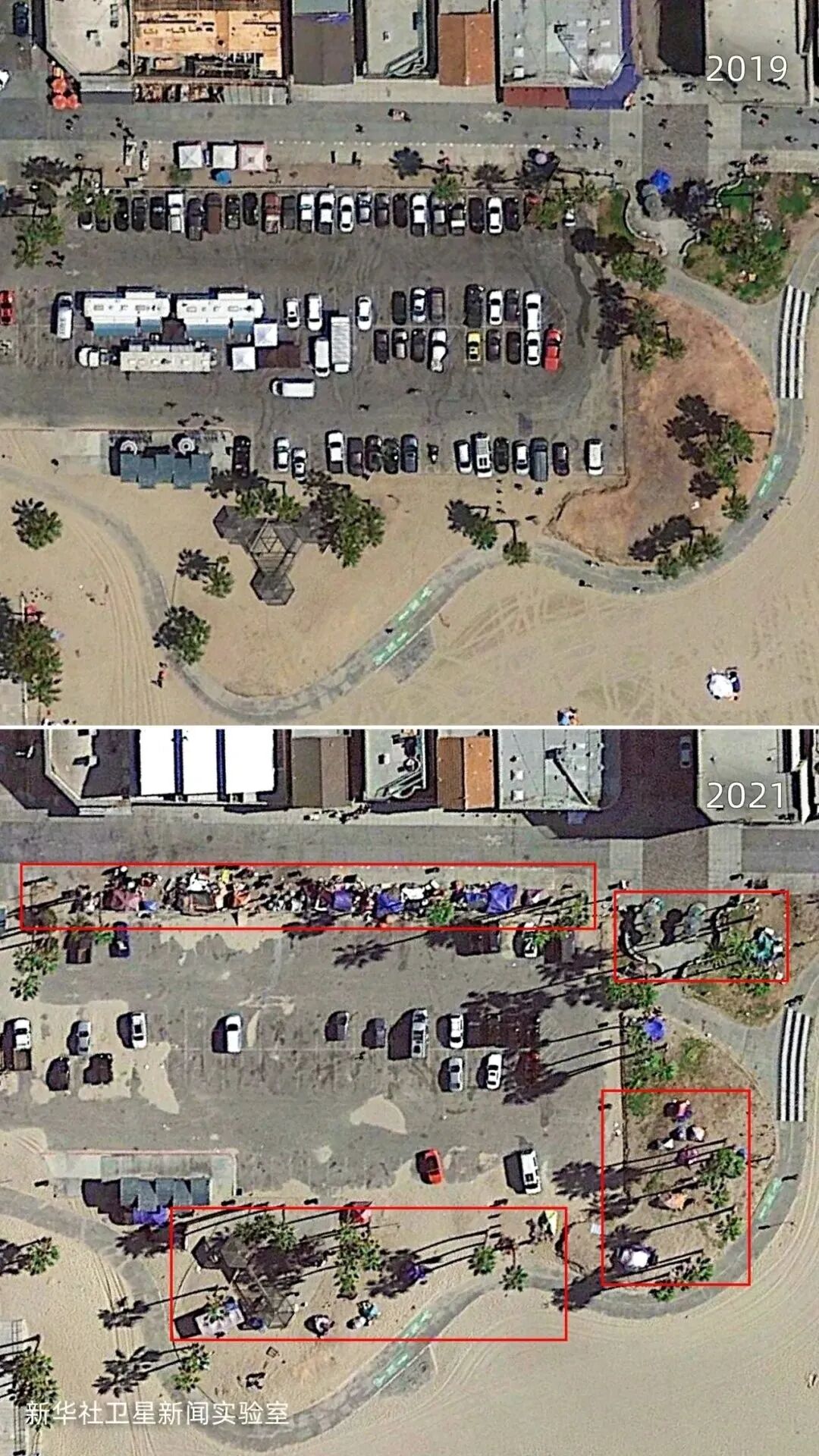 近日,新华社卫星新闻实验室对美国西海岸大城市洛杉矶、旧金山、奥克兰、圣荷西进行了一次集中观测。结果显示,无家可归者露宿的区域比2019年增加了4倍,有的城市甚至增加了10倍,而且地点更为分散,从住宅区到海滩公园,连高速公路边的绿地也出现了集中搭建的帐篷。