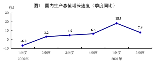 国家统计局公布的数据,初步核算,上半年国内生产总值532167亿元,按可比价格计算,同比增长12.7%,比一季度回落5.6个百分点;两年平均增长5.3%,两年平均增速比一季度加快0.3个百分点。分季度看,一季度同比增长18.3%,两年平均增长5.0%;二季度增长7.9%,两年平均增长5.5%。
