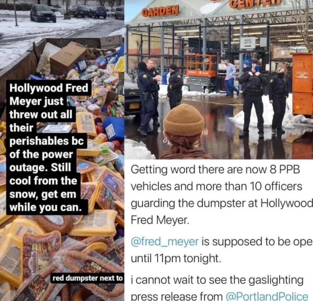 今年在大雪灾之下,美国俄勒冈州大型连锁超市Fred Meyer为了防止饥寒交迫的流浪汉捡拾超市扔在垃圾场里的过期食物,果断的叫来了警察,把垃圾桶团团围住,防止饥肠辘辘的灾民流浪汉捡食物!