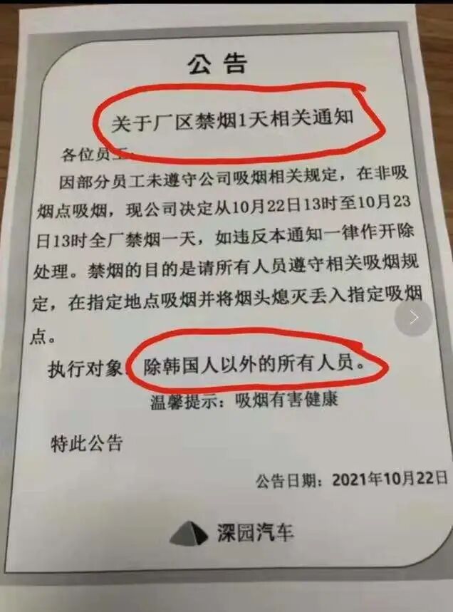 近日,深园汽车南京厂区发布的一则禁烟公告引发了众怒。该公告表示:本月22日13时至23日13时,整个工厂禁烟一天。本来禁烟并没有什么问题,但是公告后面却出现了这么一句话“执行对象为除韩国人以外的所有人”。换句话说,这则公告是专门针对中国人制定的。好家伙,在中国的地盘明目张胆的歧视中国人,这家叫深园公司有何来头。