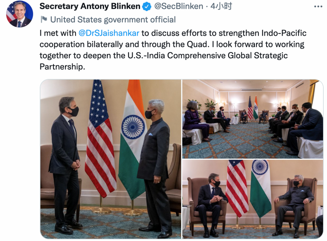 美国务卿布林肯声明称今日会见了印度外长,讨论了通过双边和四方(美日印澳)机制加强印-太合作的努力。布林肯表示期待着共同努力,深化美-印全面全球战略伙伴关系。