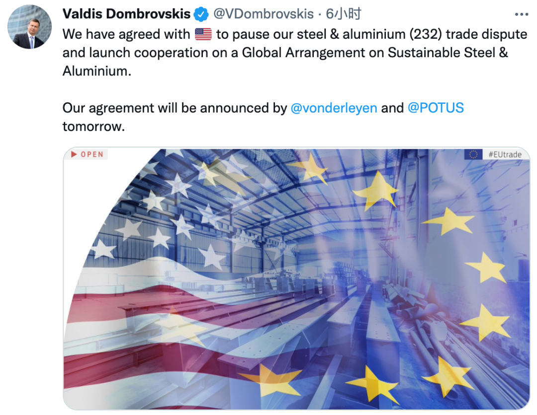 欧盟贸易专员声明称,欧盟与美国同意停止钢铝贸易争端,并就未来一项可持续的钢铝全球协议开展合作。美国总统拜登和欧盟执委会主席冯德莱恩将在明天正式宣布这项协议。据报,协议将允许“有限”的欧盟生产的钢铝产品免税进入美国。