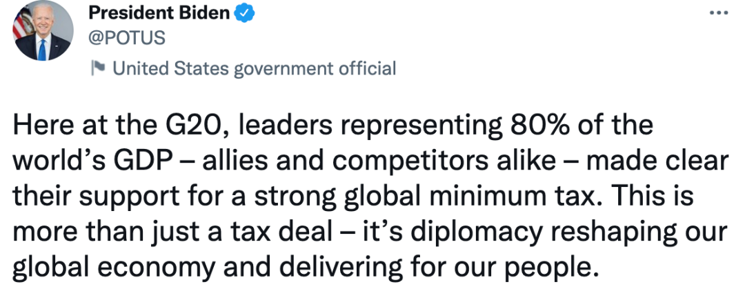 美国总统拜登声明,在G20会议上,占全世界80%GDP的国家的领导人——无论是盟友还是竞争对手——明确表示支持全球最低税收(提议)。