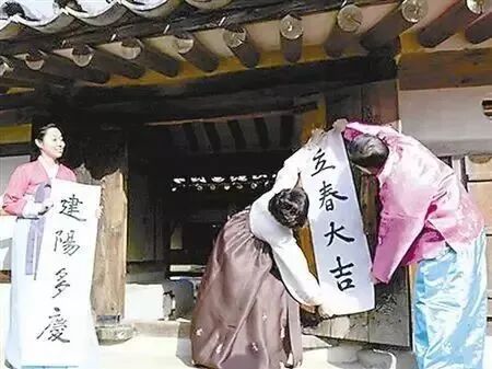 韩国的春联,是用白纸黑字书写,来来回回就八个字“立春大吉 建阳多庆”,而且还是歇着贴,如同“八字胡”。