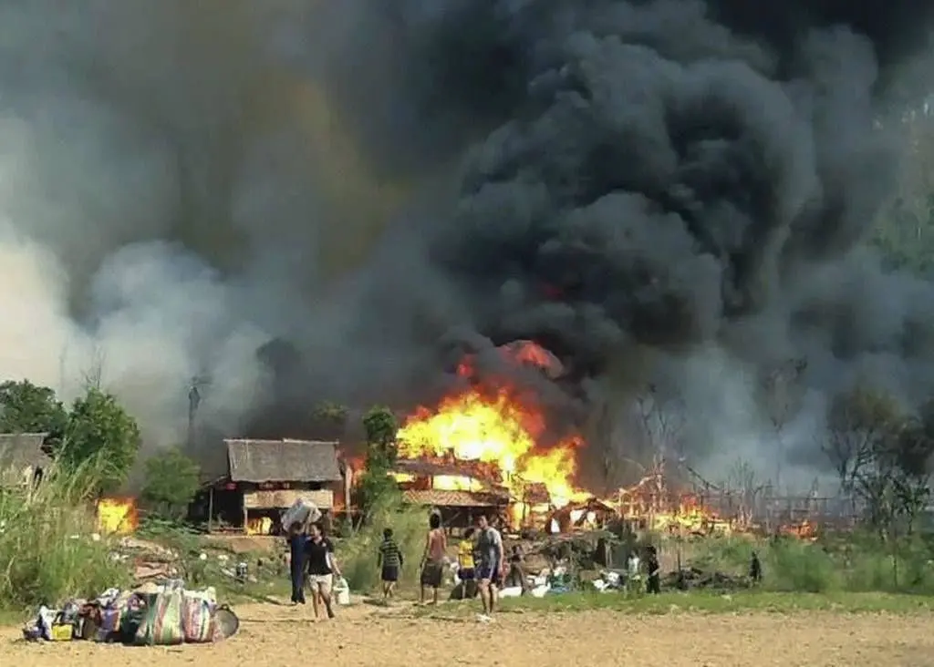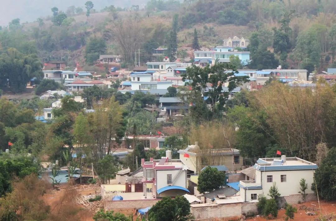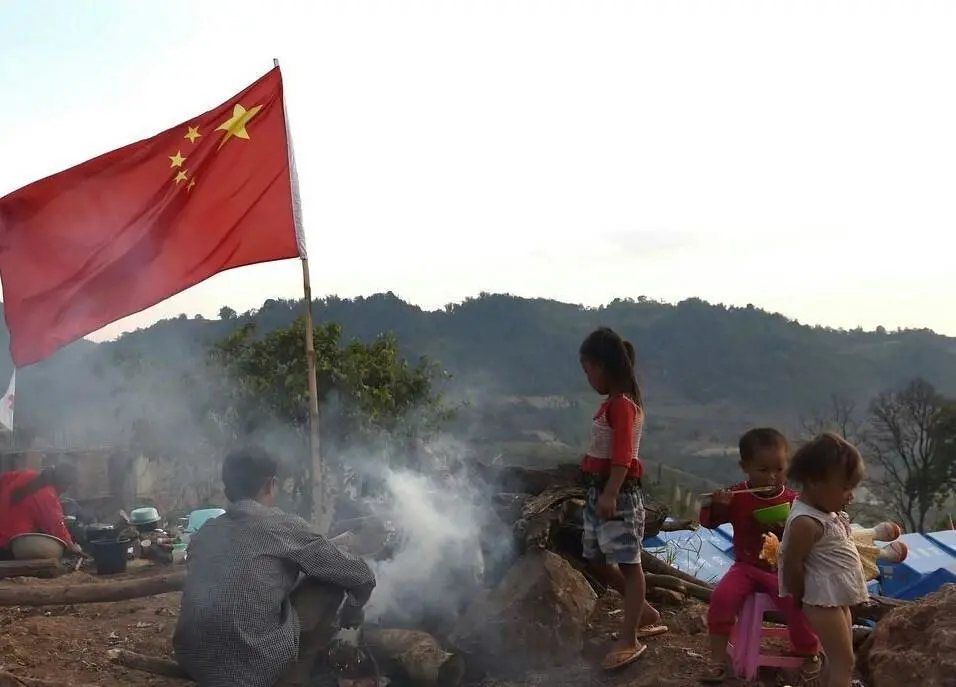 【果敢难民逃入中国,窝棚前插五星红旗,以防炮弹乱枪】