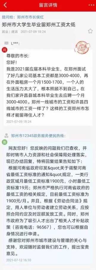 一名应届本科毕业生在郑州市长热线反映,自己面试了郑州几家公司,基本工资都在3000-4000元,而租房一个月则需要1500-1700元,生活压力太大。郑州12345政务服务便民热线回应:根据规定,郑州严格执行省政府的最低工资规定,目前最低工资标准为1900元/月。