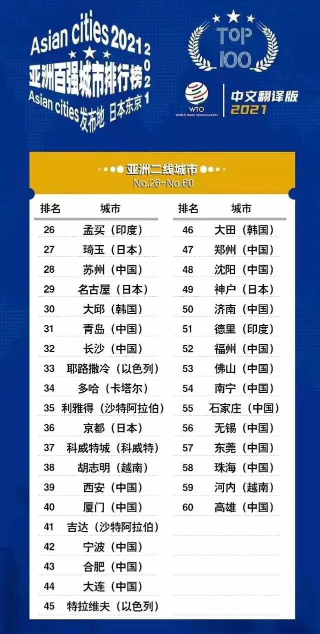 在二线城市排名中,排名第一的并不是中日韩的国家,而是印度的孟买,孟买是印度的第一大城市,孟买也是印度最富裕的城市,这里的百万富翁和千万富翁冠绝印度所有城市,重要的贸易中心和港口城市。二线城市里面总共有35个城市,在这个档次里面,中国有19个城市入列,从数量上来看也占据了一半的席位,分别是苏州、青岛、长沙、西安、厦门、宁波、合肥、大连、郑州、沈阳、济南、福州、佛山、南宁、石家庄、无锡、东莞、珠海、高雄。