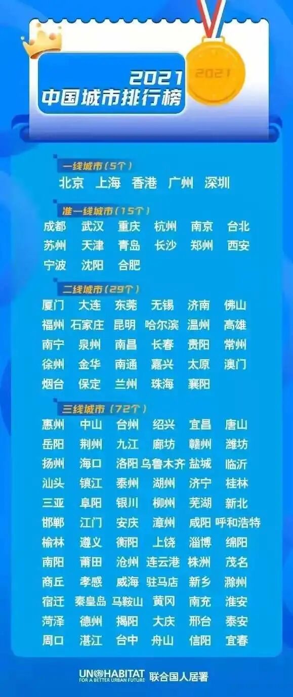 我们也能看到,在亚洲一线城市的25个城市中,中国的城市占据了12个,也就是说一线城市一半都是中国的城市,分别是上海、香港、北京、广州、深圳、成都、武汉、杭州、重庆、南京、台北和天津。而就在前不久联合国人居署发布的一个名单里面,这些城市也都是中国的一线城市。