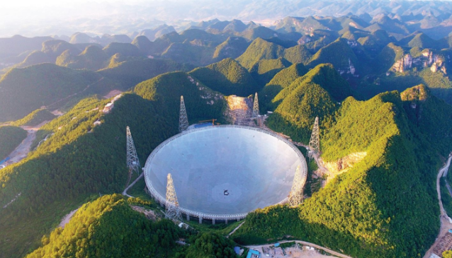 这个伟大的设备主要是由反射面系统以及测量与控制系统接收机和终端,以及观测基地等各大部分组成,主要位于贵州境内。这个射电望远镜的接收面积可以达到25万平方米,这也就相当于30个足球场,是在2016年建成,口径大约有500米,边框就达到了1.5千米,为了建设这个航天工程,中国用了6.67亿人民币。