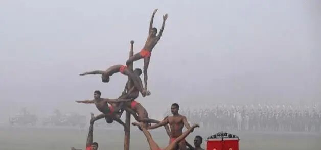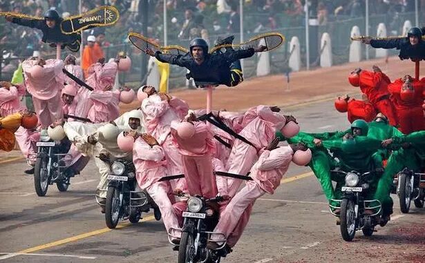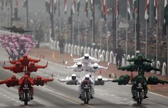 摆出各种造型,十几个人堆砌在一台小小的车上,似乎是印度这个国家从普通老百姓到军人展示战斗力必备的一项技能。在印度的阅兵典礼上有这么一个特殊队伍的存在——摩托特技队。如果要比骑摩托的技术,印度称第二这世界上怕是没有那个国家敢称第一了。