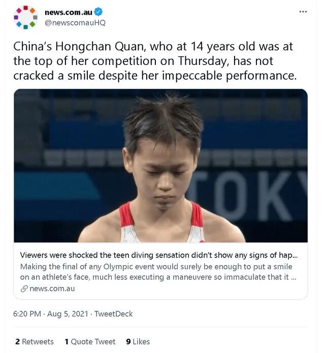 在报道全红婵夺得奥运金牌的报道中,这家媒体如此形容全红婵:全红婵即便表现惊人,拿到了满分,但却没有露出笑容,观众都被她丝毫没有愉悦心情的这一幕惊呆了。而这篇报道的标题则为:“在做出了完美的跳水后,这个少年’极度痛苦’”。