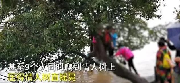 有网友在情人滩拍到了一段视频,视频中,一些大爷大妈不顾落水危险,爬到情人树上大摆Pose合影拍照,最多的时候甚至9个人同时站在树干上,压得情人树摇摇欲坠。