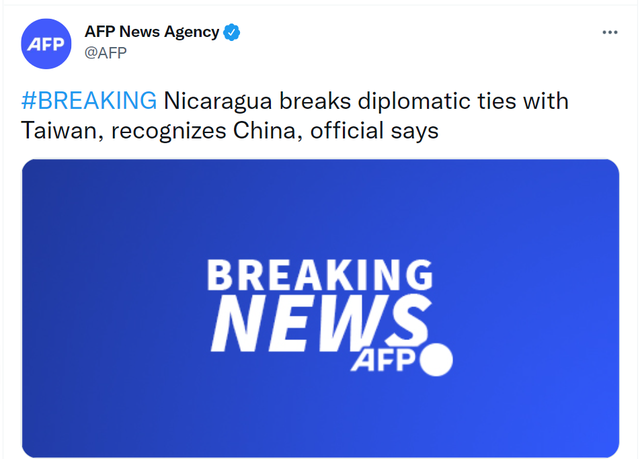 2021年12月10日,尼加拉瓜跟中国复交,成为世界上第181个承认和支持一个中国原则的国家。台湾同步丢失一个“重量级”“邦交”。