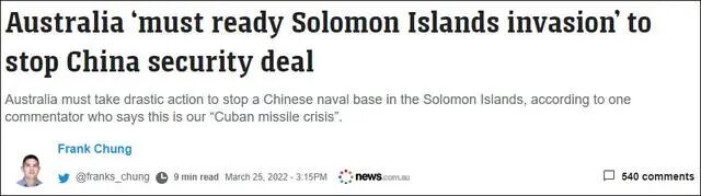 澳媒宣称所罗门群岛军事基地“必须成为一条中国不得越过的红线”。为阻止中所协议,澳大利亚应该不惜“准备好入侵所罗门群岛”,“推翻所罗门政府”。