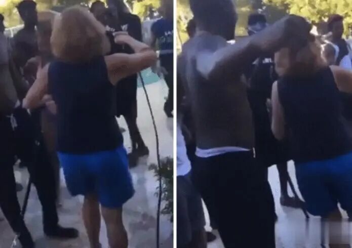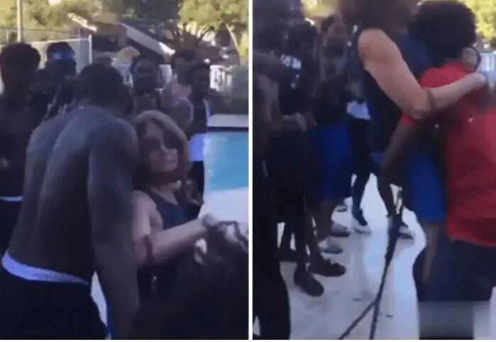 然而这还不是噩梦的结束,之后这名红衣服的黑人男子拖拽着白人女子走向一旁的游泳池,直接将其摔进泳池里。一群黑人大笑着看白人女子在泳池中挣扎,满脸嘲讽。